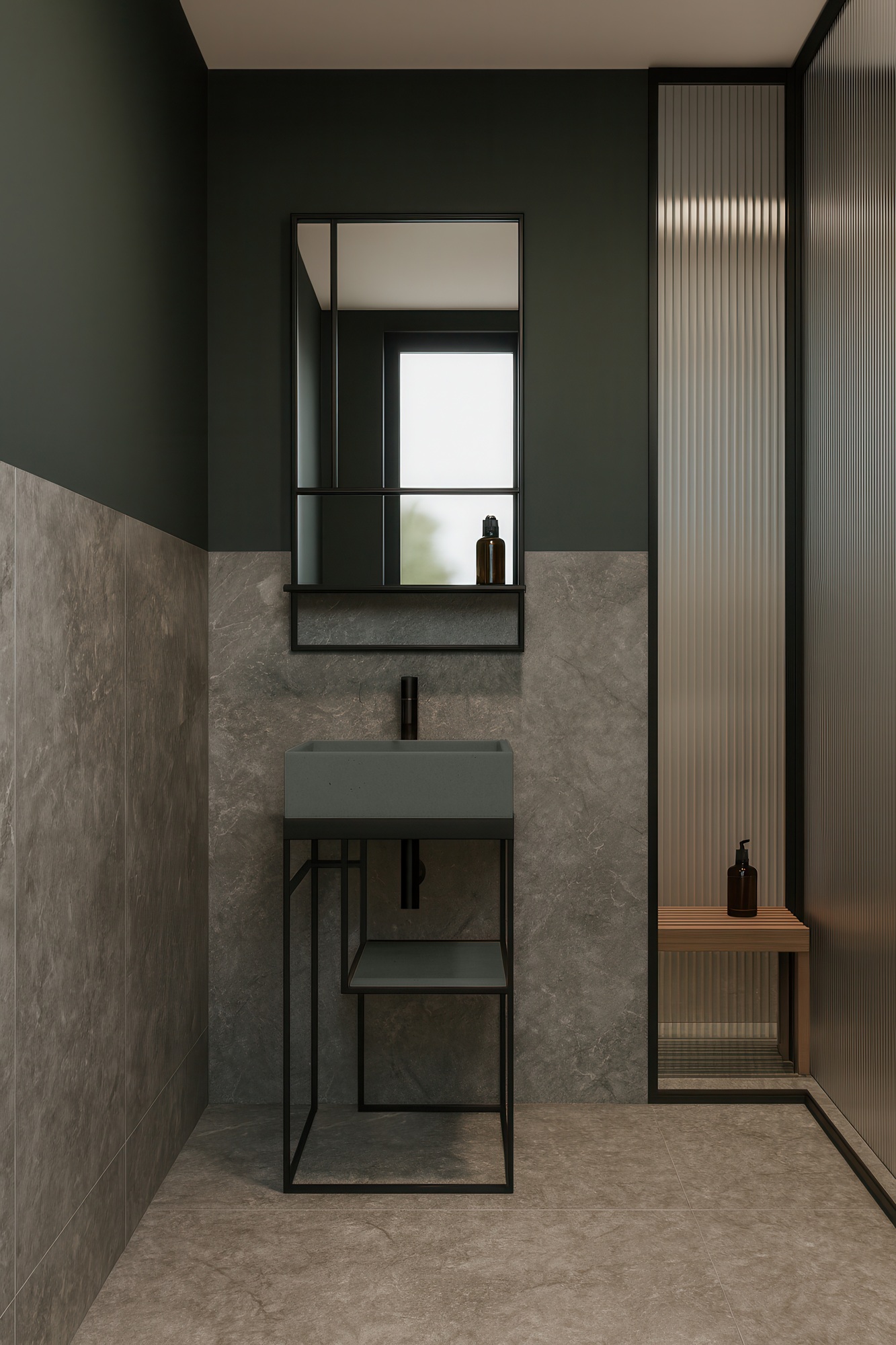 The erosion shower tray features distinctive grooves shaped as if naturally carved by water over time, allowing it to flow smoothly without accumulating. The surface also incorporates stone-like elements that reinforce the natural reference to eroded soil, staying true to the original design concept.