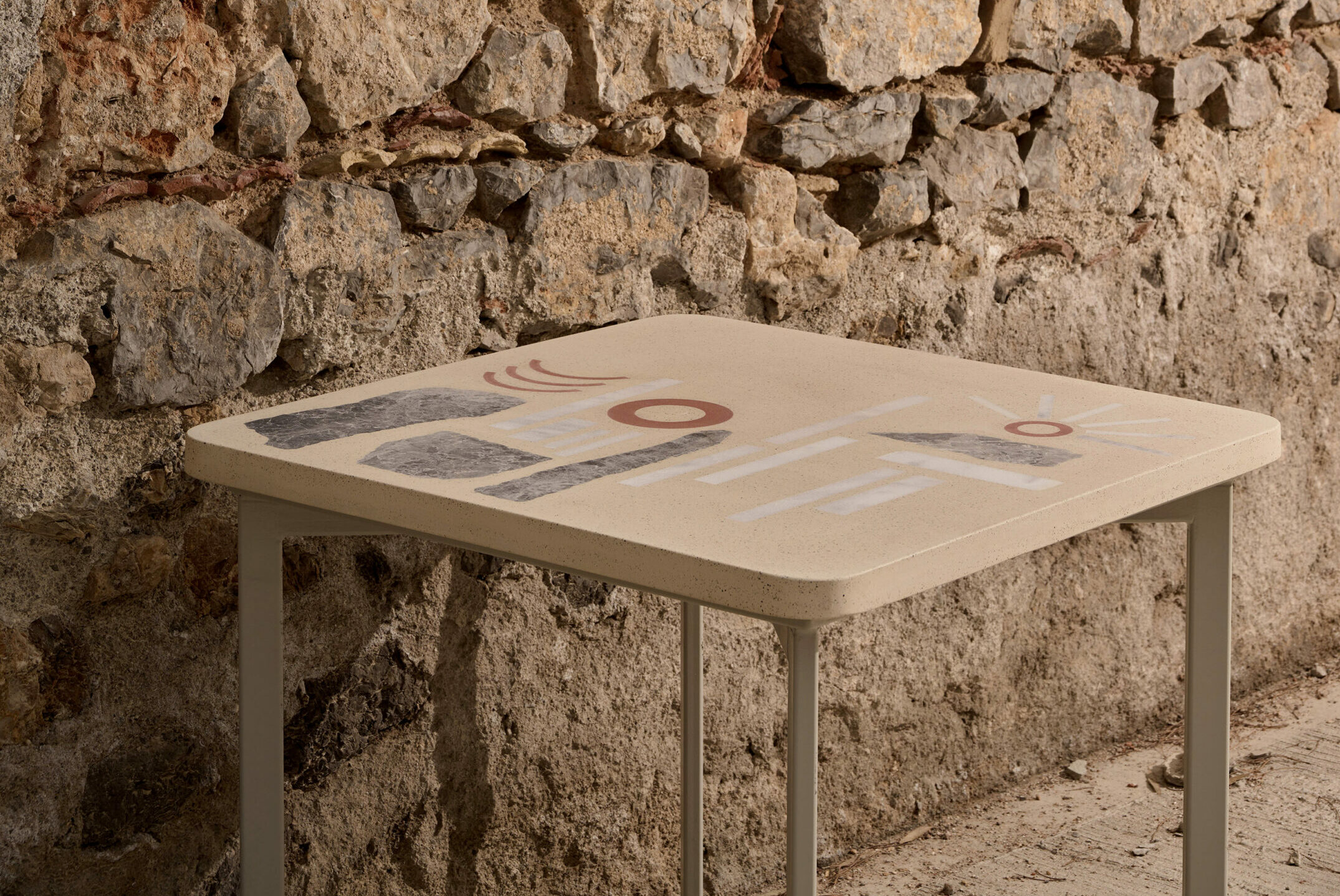 The Legante tables are crafted from cast concrete, combined with pieces of materials sourced from the remnants of a nearby marble workshop and a traditional ceramic studio, adding an extra dimension of sustainability to their dynamic inspiration. This fusion creates a contemporary terrazzo, reflecting the diverse cultural mosaic of the Mediterranean basin. People sailing across its waters exchanged goods and knowledge, leaving traces of their passing, lifestyles, and constructions, building cities with local stones, terracotta bricks, and tiles. Discover more on : urbietorbi.gr